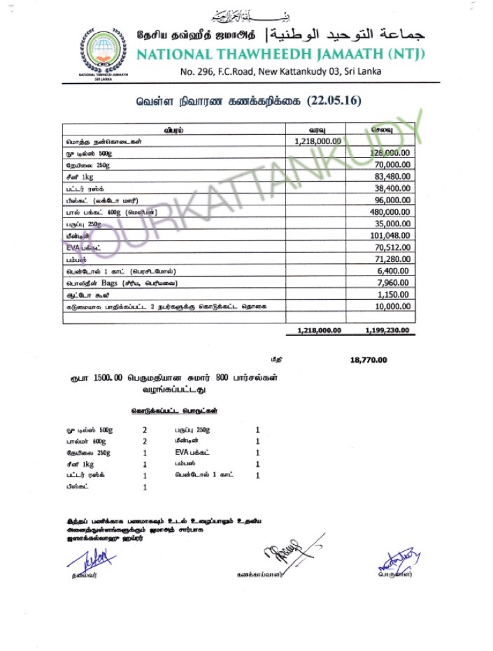மல்வானைப் பகுதியில் NTJ வழங்கிய வெள்ள நிவாரணத்திற்கான கணக்கறிக்கை