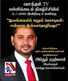இன்று (03.07.2016) இரவு 09.00 மணிக்கு வசந்தம் தொலைக்காட்சியில் இடம்பெறவுள்ள பள்ளிக்கூடம் நிகழ்ச்சியில் நல்லாட்சிக்கான தேசிய முன்னிணியின் தவிசாளர் பொறியியலாளர் அப்துர் ரஹ்மான் அவர்கள் கலந்து கொண்டு ‘இலங்கையில் ஊழல் மோசடிகள் எவ்வாறு இல்லாதொழிப்பது..? என்பது தொடர்பில் கருத்துரை வழங்கவுள்ளார்.