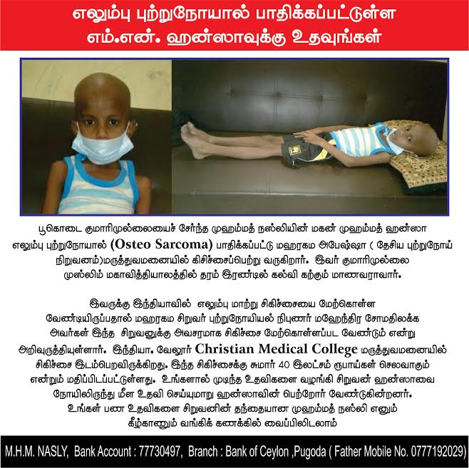 பூகொடை குமாரிமுல்லையைச் சேர்ந்த முஹம்மத் நஸ்லியின் மகன் முஹம்மத் ஹன்ஸா எலும்பு புற்றுநோயால் (Osteo Sarcoma) பாதிக்கப்பட்டு மஹரகம அபேஷ்ஷா ( தேசிய புற்றுநோய் நிறுவனம்) மருத்துவமனையில் கிசிச்சைப்பெற்று வருகிறார். இவர் குமாரிமுல்லை முஸ்லிம் மகாவித்தியாலத்தில் தரம் இரண்டில் கல்வி கற்கும் மாணவராவார்.