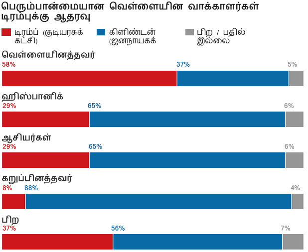 முதியவர்களில் பெரும்பான்மையானோர் டிரம்புக்கு ஆதரவாக வாக்களித்திருக்கிறார்கள். ஆனால், இளையோர் ஆதரவு ஹலரிக்குத்தான். ஆசிய இனத்தவர், கறுப்பினத்தவர்களின் ஏகோபித்த ஆதரவு ஹிலரிக்குத்தான். இருந்தாலும், வெள்ளையினத்தவர்களின் பெரும்பான்மை ஆதரவு டிரம்பின் பக்கம் சென்றுவிட்டது.