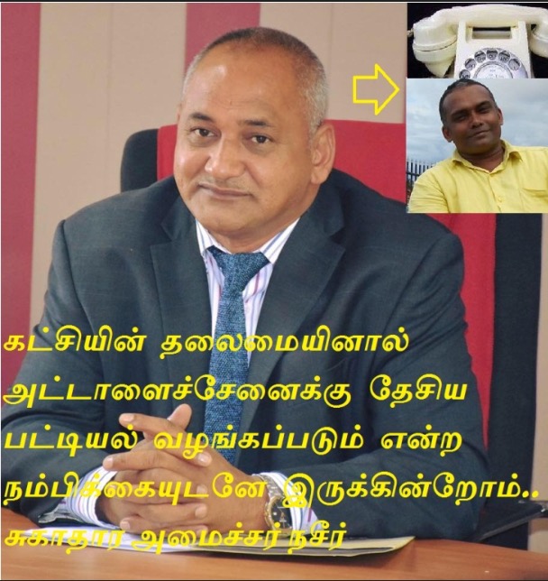 மேற்குறித்த விடயத்துடன் சேர்த்து விமர்சனங்களுக்கு உள்ளாகியுள்ள முஸ்லிம் காங்கிரசின் தலையின் பதில்கள் சமபந்தமாக முஸ்லிம் காங்கிரசின் கோட்டையான அட்டாளைச்சேனையினை பிரதி நிதித்துவப்படுத்துகின்ற மிக முக்கியமான அரசியல்வாதியும், கட்சித் தலைமையின் விசுவாசத்தினை பெற்ற அம்பாறை மாவட்ட கிழக்கு மாகாண சபை உறுப்பினரும், சுகாதார அமைச்சருமான நசீரினை தொலை பேசி ஊடாக தொடர்பு கொண்டு வினவிய வேளையில் முஸ்லிம் காங்கிரசின் தலைமையினை எந்த நிலைமையிலும் மதித்து நடக்கின்ற அட்டாலைச்சேனை பிரதேசத்து மாக்களான நாங்கள் அட்டாளைசேனைக்கு கட்சியின் தலைமை தேசிய பட்டியல் வழங்கும் என்ற நம்பிக்கை இன்னும் இருப்பதாக தெரிவித்தார்.