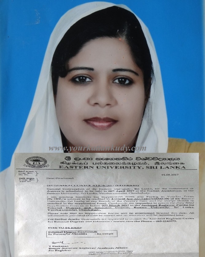 ஏறாவூர்: கடந்த வருடம் செப்டம்பர் மாதம் ஏறாவூரை அதிர்ச்சிக்குள்ளாக்கிய தாய், மகள் இரட்டைப் படுகொலைச் சம்பவத்தில் கொல்லப்பட்டவரான ஜெனீராபானு மாஹிர் (வயது 32) என்ற பெண்னுக்கு ஏப்ரல் 8ஆம் திகதி இடம்பெறவுள்ள பட்டமளப்பு விழாவில் கலந்து கொள்ளுமாறு அழைப்பு கடிதம் அனுப்பி வைக்கப்பட்டுள்ளது. அழைப்புக் கடிதத்தைப் பெற்றுக் கொண்டதும் தான் கதறி அழுததாக கணவர் மாஹிர் தெரிவித்துள்ளார்.