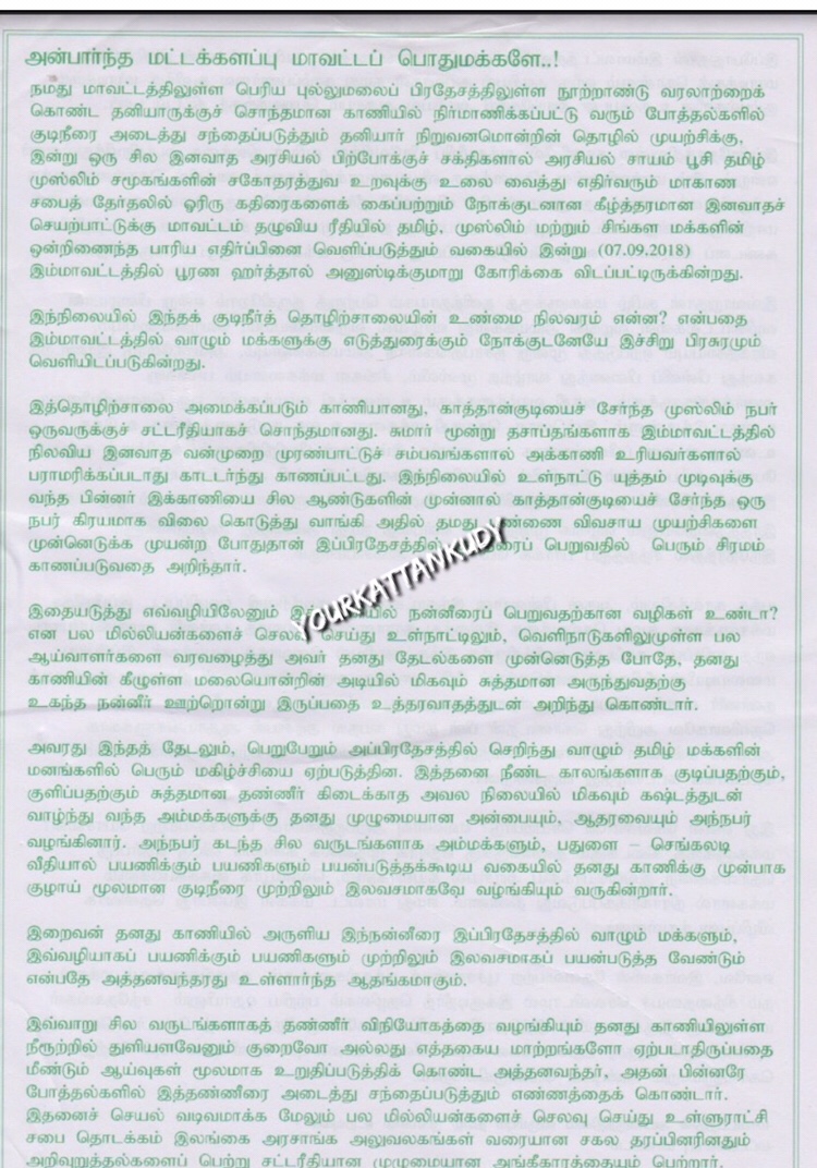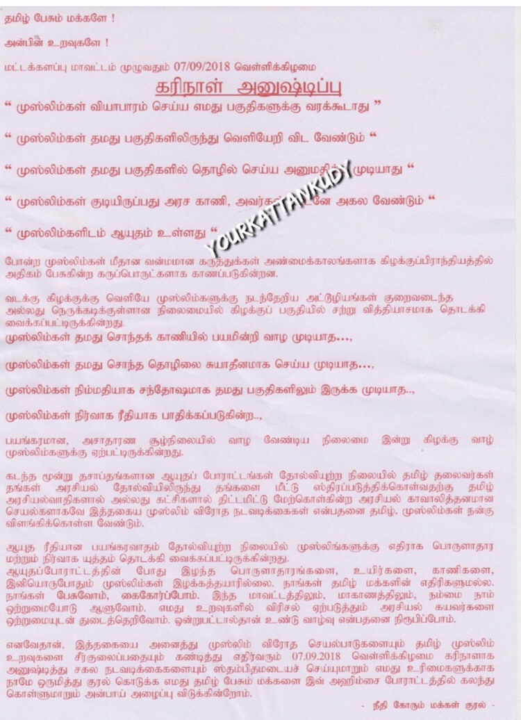 மட்டக்களப்பு மாவட்டம் முழுவதும் நாளை 07ம் திகதி வெள்ளிக்கிழமை தமிழ் மற்றும் முஸ்லிம் மக்களை ஹர்த்தால் அனுஷ்டிக்குமாறு துண்டுப்பிரசுரங்கள் மூலம் அழைப்பு விடுக்கப்பட்டுள்ளது.