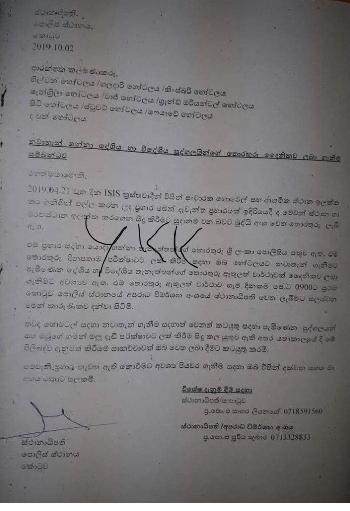 ஏப்ரல் 21 போன்று மீண்டும் ஹோட்டல்களில் தாக்குதல்கள் இடம்பெறலாம் என அந்த கடிதத்தில் தெரிவிக்கப்பட்டுள்ளமை குறிப்பிடத்தக்கது. கொழும்பு கோட்டை காவல்துறையினரினால் அனுப்பப்பட்ட கடிதமென அதில் குறிப்பிடப்பட்டுள்ளதாகவும் பல ஹோட்டல்களிற்கு இந்த கடிதங்கள் அனுப்பப்பட்டுள்ளதாகவும் தகவல்கள் வெளியாகியுள்ளன.