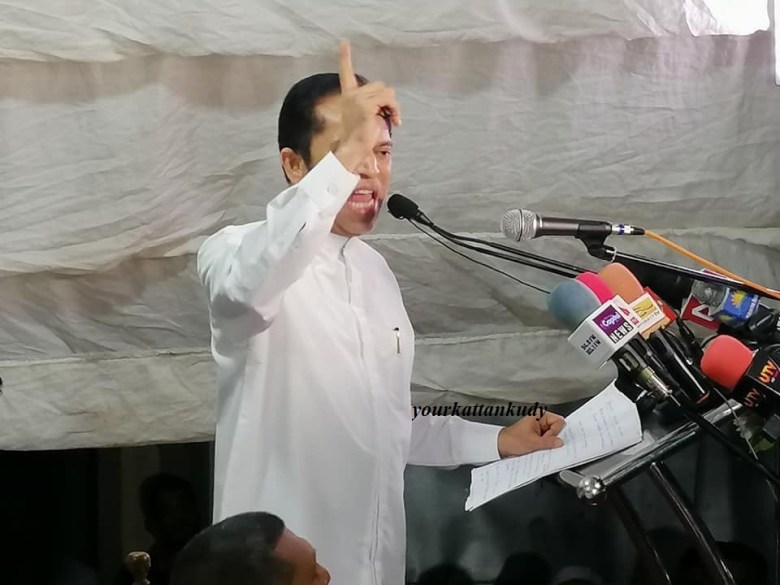 காத்தான்குடி: ஜனாதிபதி வேட்பாளராக ஒட்டகச்சின்னத்தில் போட்டியிடும் எம்.எல்.ஏ.எம். ஹிஸ்புல்லாஹ்வின் முதலாவது தேர்தல் பிரச்சாரக்கூட்டம் காத்தான்குடி குர்ஆன் சதுக்கத்தில் (11) சற்று முன்னர் இடம்பெற்றிருந்தது. மக்கள் எதிர்பார்த்து வந்ததைவிட, வேட்பாளர் ஹிஸ்புல்லாஹ்வின் உரை தனித்திருந்தது ஓர் விசேட அம்சமாகும்.