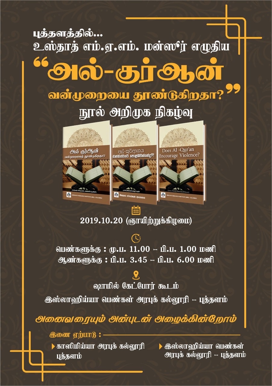 ஜாமிஆ நளீமியாவின் முன்நாள் விரிவுரையளாரும் இஸ்லாமிய ஆய்வுகளுக்கான மிஷ்காத் நிறுவனம் மற்றும் அல் குர்ஆன் கற்கைகளுக்கான திறந்த கல்லூரி என்பவற்றின் ஸ்தாபகருமான உஸ்தாத் மன்ஸூர் அவர்கள் எழுதிய “அல்குர்ஆன் வன்முறையைத் தூண்டுகிறதா?” எனும் நூல் பற்றிய மற்றுமொரு அறிமுக விழா மற்றும் கலந்துரையாடல் நிகழ்வு இன்ஷாஅல்லாஹ் எதிர்வரும் ஞாயிற்றுக்கிழமை (20/10/2019) புத்தளம் இஸ்லாஹிய்யா பெண்கள் அரபுக் கல்லூரியில் இடம்பெறவுள்ளது.