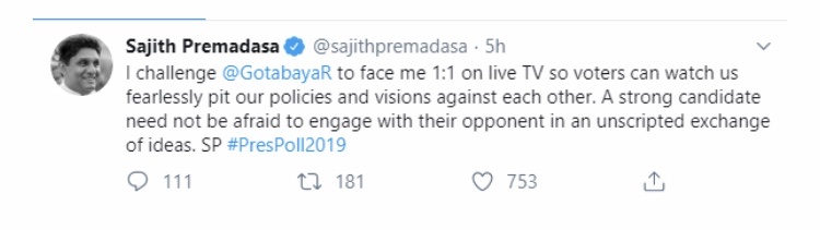 நான் கோத்தாபய ராஜபக்ஷவை தொலைக்காட்டியொன்றில் நேரடி விவாதத்திற்கு அழைக்கின்றேன். அதனால் அச்சமின்றி வாக்காளர்கள் எமது கொள்கைகளையும் இலக்குகளையும் தெளிவாக புரிந்துகொள்ள முடியும்.