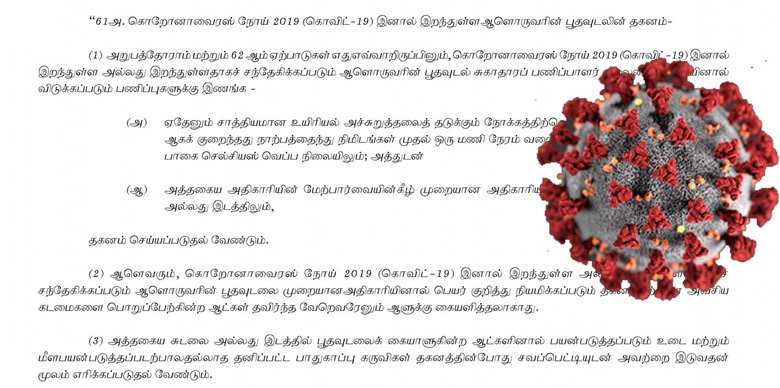 கொழும்பு: கொரோனாவைரஸ் காரணமான கொவிட்-19 நோயினால் மரணிப்பவரின் பூதவுடலை தகனம் செய்வது தொடர்பில், சுகாதார அமைச்சர் பவித்ரா வன்னியாரச்சியினால் அதி விசேட வர்த்தமானி அறிவித்தல் வெளியிடப்பட்டுள்ளது.