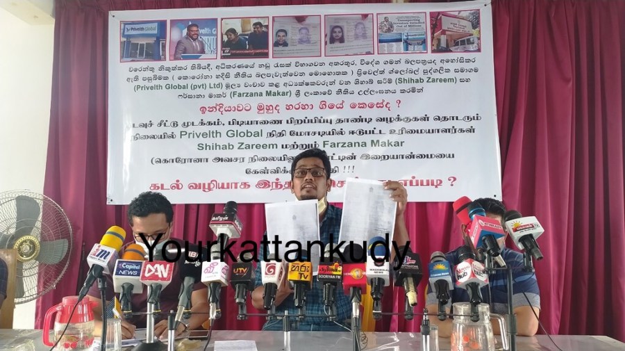 பிரிவேல்த் குளோபல் நிதி நிறுவன தலைவர் முகாமையாளர் என கூறப்படும் கணவன் மனைவியான அகமட் சரிம் முகம்மட் சிஹாப் (வயது 46) மற்றும் பாத்திமா பர்ஸானா மாக்கார் (வயது 39) மகன் சிஹாப் அப்துல்லா முகம்மட் வசீம் (வயத 10) இந்தியாவிற்கு சட்டவிரோதமாக படகு ஒன்றில் சென்ற நிலையில் நேற்று கைதாகியுள்ளனர்.